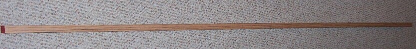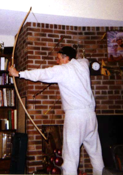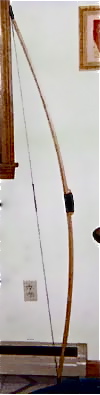 Handle bows are much easier to shoot for me. Since the handle does not bend little shock is felt when the arrow is released. Find the center. Measure 8 in. on each side for the handle. Glue on an extra 8 in.piece of a hardwood for the handle section. Shape the handle so the extra piece blends evenly to the bow. Tiller this style so that the bend starts right at the end of the handle section and increases as you go towards the nocks. The handle section may be narrowed or left 1.5 in. wide. The handle may be narrowed to 1 in to 1.25 in. if you prefer. The handle section where you hold the bow can be 4 in. long. From the end of that 4 in. on the upper and lower limbs on the back of the bow draw a line to the end of the glued piece on each side of the upper and lower limbs. These will be you fades. Remember the bend should not start until the bow begins to widen which should be at the end of the extra piece you glued. These handle bows are best left until you have made a bend in the handle bow or 2 and a slightly stiffened handle bow as I have described above. Proceed to Bow making Directions for more information. Feel free to email me your questions. This is an English longbow made from a red oak board. It is 71 inches nock to nock, has a rounded belly in the traditional style of the longbow, and horn nocks. Here is the bow braced.