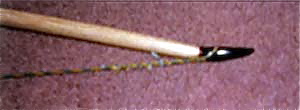 When making the bow, Be sure you round off all 4 edges with sandpaper. Measure out the center line which would be 34 in. for a 68 in. bow. Measure 2 inches on either side of that. That's your handle area. At both nocks find the center. Measure out 0.75 in. nocks. 3/8 in. on either side of center. You may also use 0.5 in. nocks if you prefer. Adjust your measurements accordingly. Find mid limb on both limbs. Draw a line from the nock to the mid limb point on both sides of that limb. Repeat on the other limb. Slowly remove wood with a draw knife (what I use) or a saw. A nice sharp hand saw would do it or a band saw. Belt sanders work fine. Power tools are best left for later, however, for the beginning bowyer. Do this on all 4 sides. You have cut out the outline of your bow. Orient the bow with the back on top. At the nock end of each limb measure down 3/8 in. Draw a line from there to the end of the handle on both limbs. Remove the wood and proceed to floor tillering stage under Bow making Directions which may be found elsewhere on this site. You will have a bow with a slightly stiffened handle section. If you want a bend in the handle bow, which is even easier to tiller, when you are laying out your bow, run the edge line right to the mid point. Once again you would measure down 3/8 in. from the nock and draw the line right to the center point of the bow on the belly side--44 in. in our example. This would produce a classic bend in the handle bow starting to bend in the handle area with the bend increasing toward the limbs. Remember to always round the edges of the board with sandpaper.