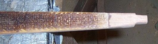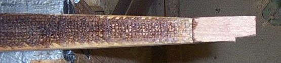 Burlap, which is composed of jute fibers and which may be found in garden stores, makes a great backing. Simply cut it to size and glue it on with a wood glue. Two pieces may be oined at the handle. Once the glue dries, trim the edges with a scissors or sharp knife, and sand as needed. Reapply glue to any frayed edges. The burlap may be stopped a few inches from the nocks.