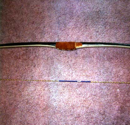 My non bending handle section of 7.5-8 inches allows for most of the bow's length to be used for propelling the arrow. I leave it wide and a max of 1.75 inches thick until the end. I bring the bow to full draw and then I mark out and cut the handle. I can postpone my choice of upper and lower limbs that way even though I may have the eventual limb orientation in mind. Find the center, measure up 1.25 inches and down 4 inches from that. That's the handle area. The arrow is shot 1.25 inches above center. Measure down 1 inch on the lower limb for the lower fade. Measure the actual limb length on the lower limb and adjust the upper fade accordingly to make both limbs the same size. It should be 2 inches or more. The bending portions of both limbs are about the same size even though it may not appear that way because of the handle design. Do spend time getting the bow to begin bending just after the end of the fades.