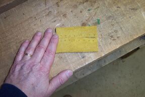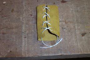 I shoot the narrow 1.5 inches above center. Cut a suitable sized leather strip. Bevel the bottom edge with sandpaper. If this piece isn't thick enough cut another a little narrower and glue it on the first piece. This is the arrow shelf.