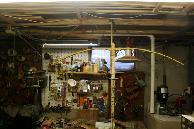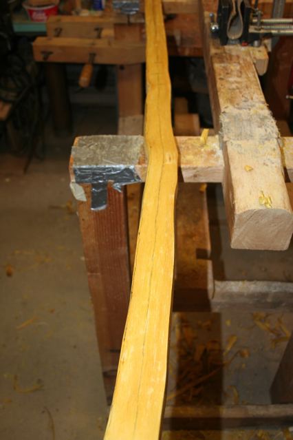 The above photo shows the stave in my rope and pulley for long stringing tillering. I use sash cord. I long string tiller out to 10 inches. I remove wood in order to get a good bend to the limbs. I check weight with my hand held scale looking to obtain 5# over final target weight.