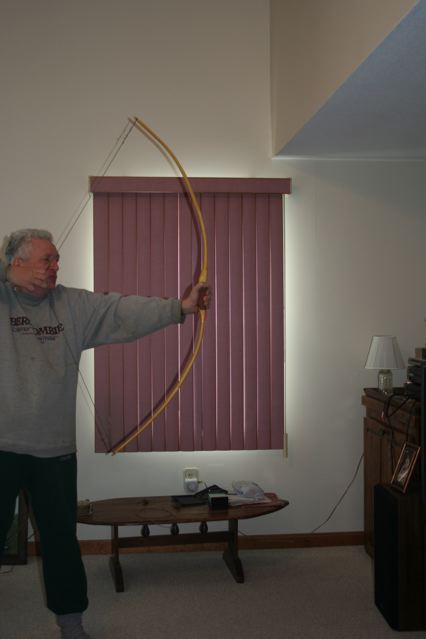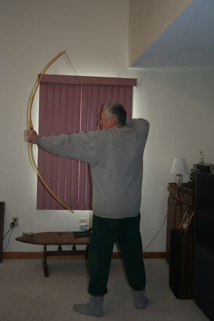 Thus, if I want a 50 pound bow. I look to get around 55 pounds at 10 inches. This puts the stave at around 65 pds. Perfect for stringing with the short string.