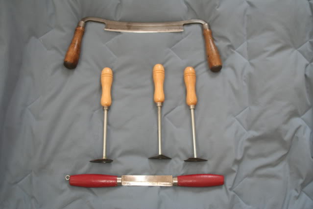 From top to bottom, the tools I use are a drawknife, shave hooks and Swedish push knife.