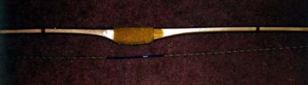This is a picture of an Australian pine (beefwood bow). The stave was a gift from Steve Sefsick and was cut in Florida. She draws 52# at 26 inches. The back of the stave showed many drying cracks, was filled in with a dilute solution of Titebond II and needed a silk backing for insurance.
