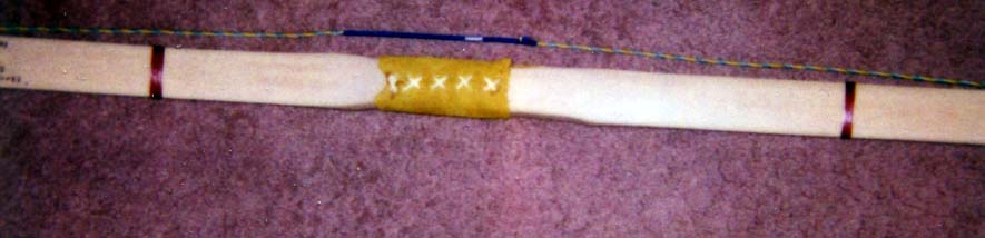 This is a picture of the belly of the bow showing the cross stitching of the handle area. the leather handle is cut to shape and an even number of holes are drilled or punched on each side. The leather may be cut a little narrower and misted with water to allow it to stretch making for a tight fit. The stitch is done starting at the top and passing both ends through each side and pulling down through the middle. Alternate the stitching. I use stout enough cord to push it through by hand. I then glue the handle leather on with Titebond II, pull it in place and tighten the stitching.