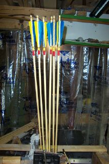 Here are the finished handplaned, barrel chested, pine arrows. Note the artificial sinew wrappings.