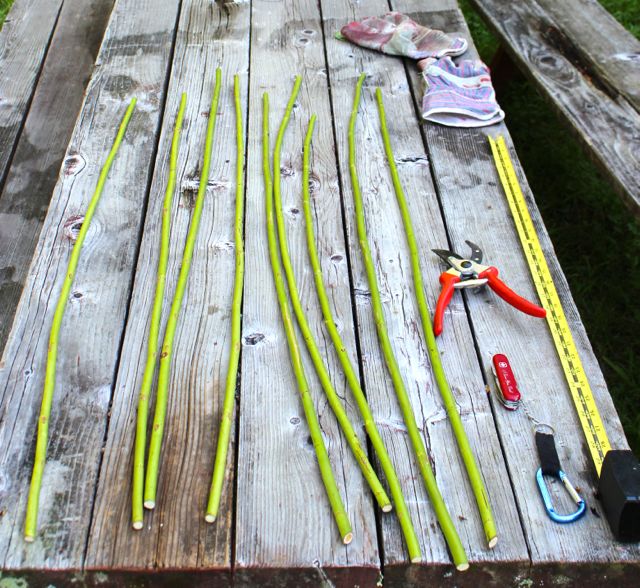I cut them to around 40" long. I use pruning shears to cut them to length and my Swiss Army knife to remove the thorns.